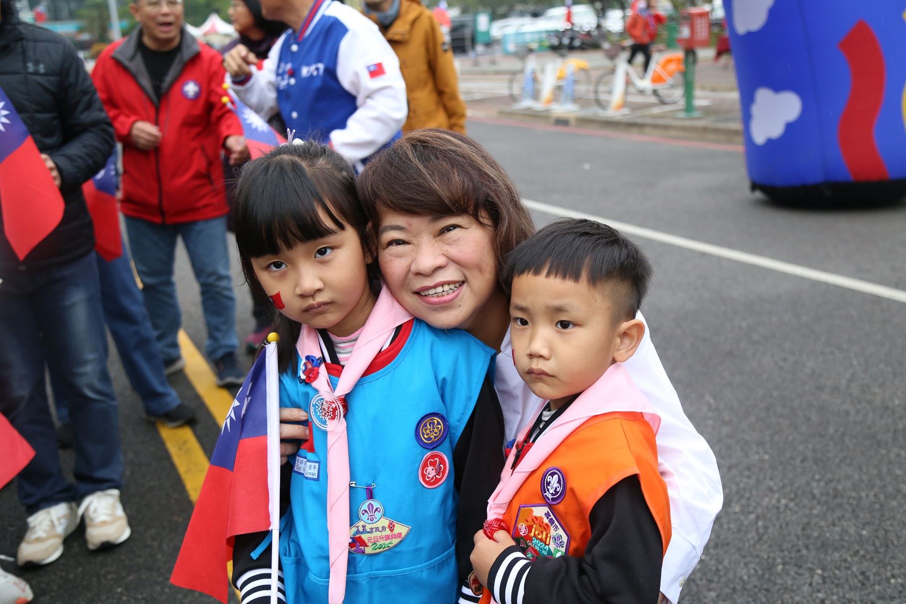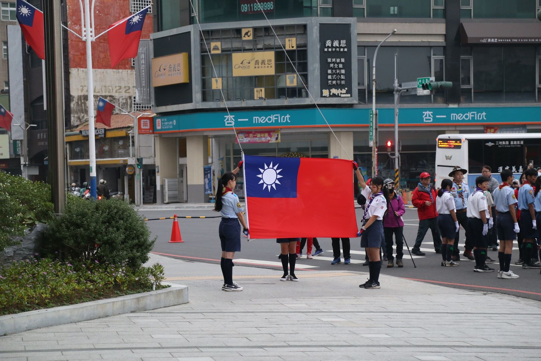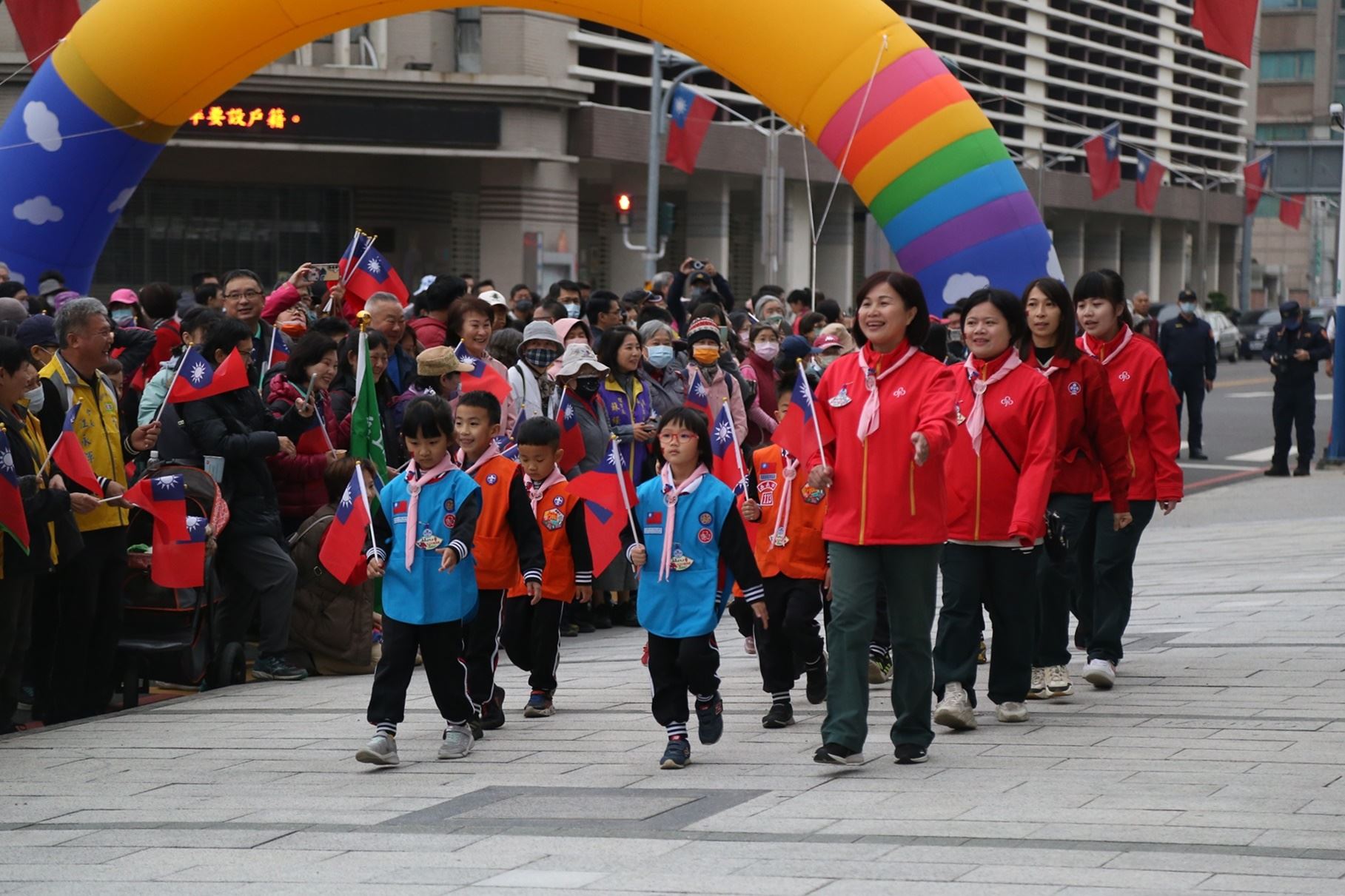 今日升旗典禮由幼獅複式童軍團、常民複式童軍團護旗進場揭開序幕,接著嘉義市客家文化協會9位成員、就讀輔仁中學5位原住民同學、7位嘉義市新住民朋友與6位童軍伙伴領唱國歌,在多元族群的歌聲中,帶領現場參與升旗典禮的民眾齊唱國歌。另為鼓勵民眾養成運動習慣,元旦升旗典禮結合健行活動,走出健康活力迎接新年到來,也改以蓋手章方式兌換紀念品,從活動細節減少紙張使用,展現嘉義市政府對環保與資源永續的承諾。