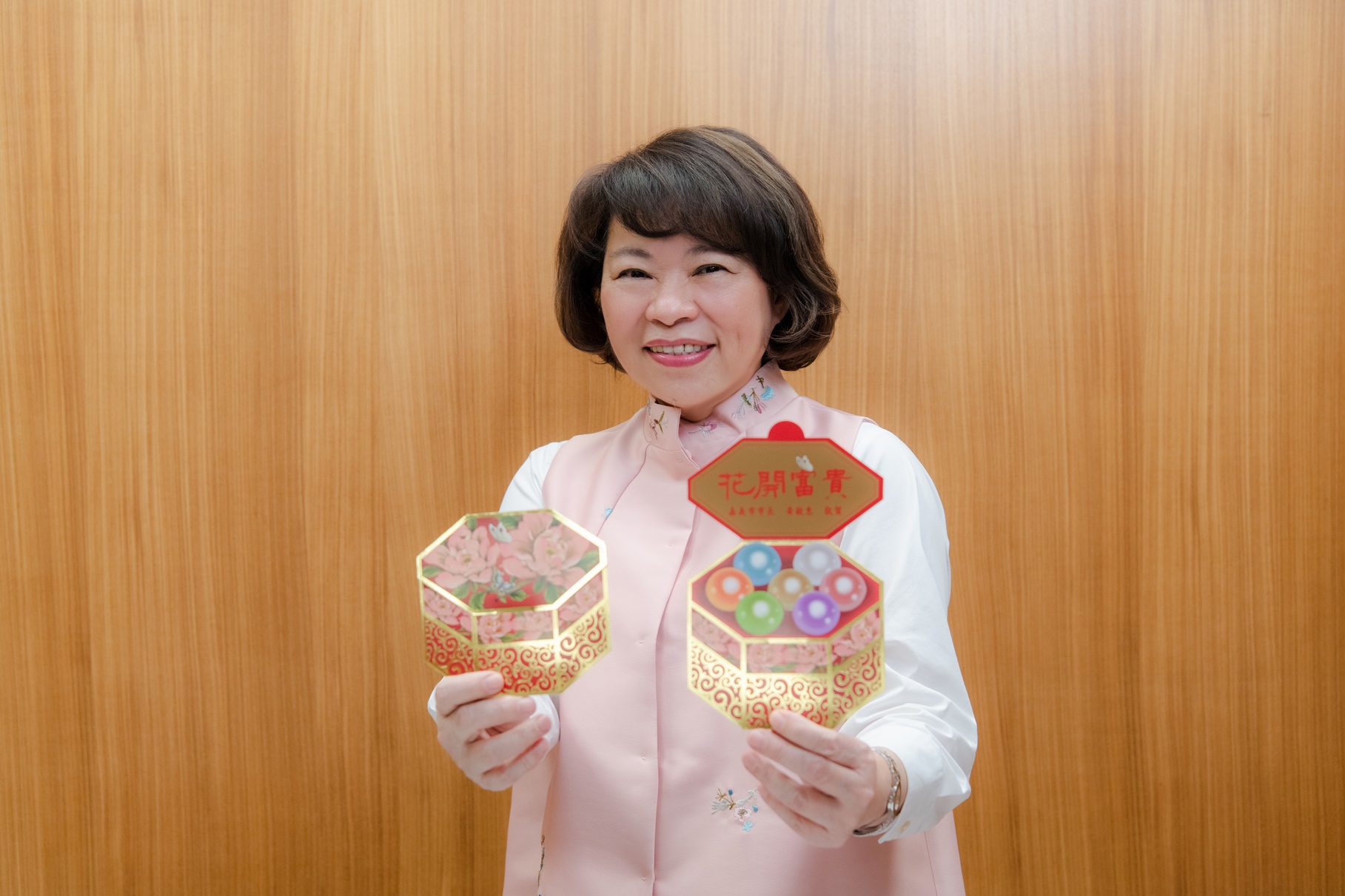 黃敏惠市長提到,為與市民一同分享新年喜氣,今年推出限量的小紅包以「百寶盒」為發想,印製燙金紋飾的百寶盒上,印製有牡丹花與蝴蝶,呼應百寶盒打開印有的「花開富貴」寓意,抽出百寶盒中間金光閃閃的寶珠可見印有「大吉」字樣的籤詩,祝賀所有人新的一年大吉大利,硬幣上的國泰民安同樣是為新的一年獻上祝福。