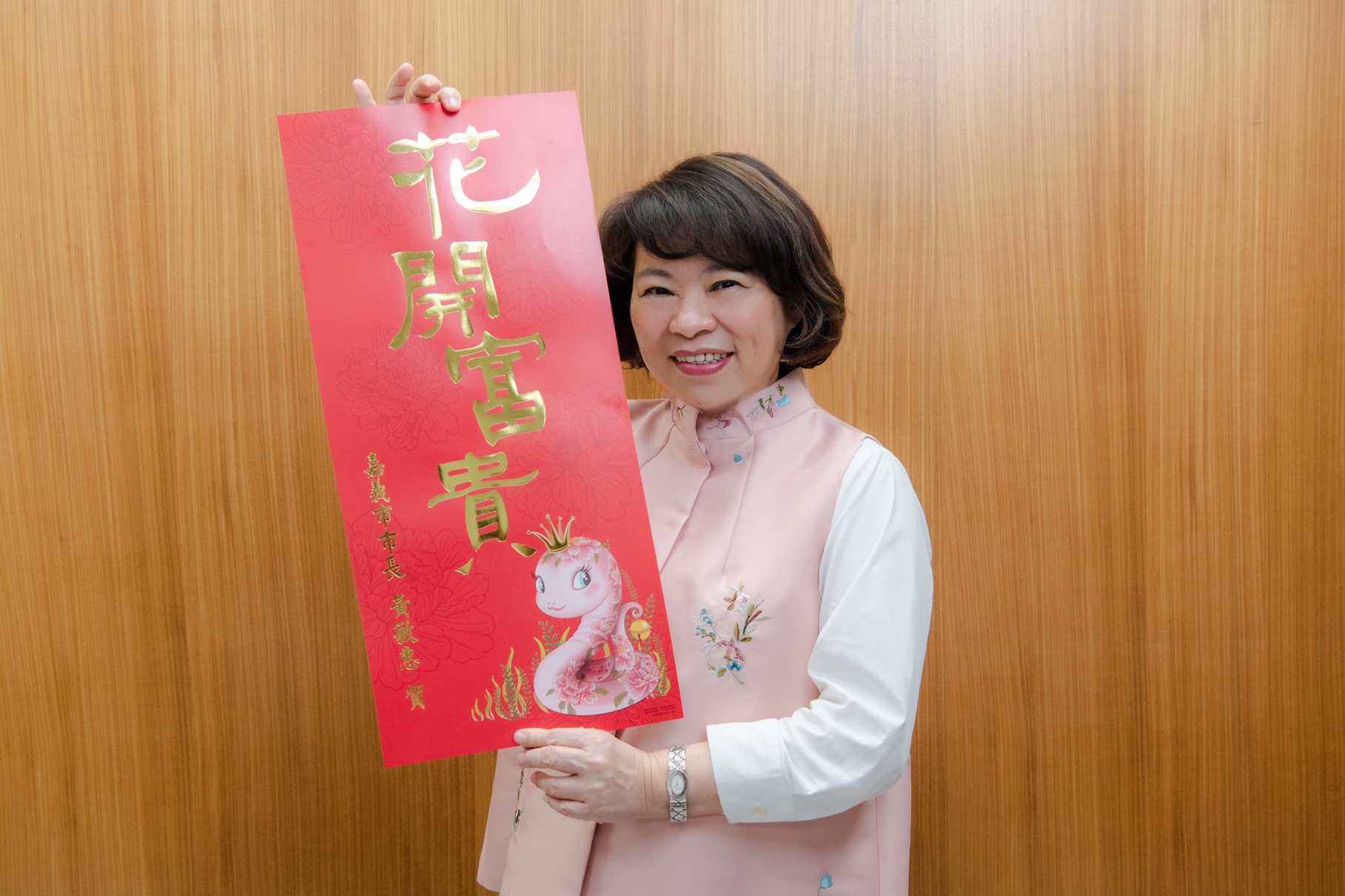 黃敏惠市長首先向全體市民傳遞新春祝賀,表示很高興今年市府再度與知名插畫家SMART莊信棠合作,並由書法家、市府前地政處長饒嘉博揮毫題字「花開富貴」,希望藉春聯將富貴與新春祝賀送到每一家每一戶,也祝福所有市民朋友新的一年「蛇」(什)麼都開心、「蛇」(什)麼順利。