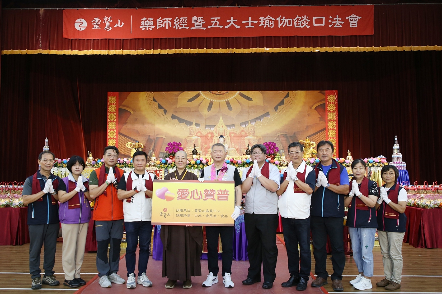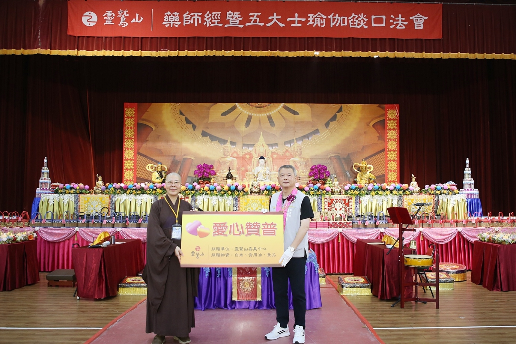 靈鷲山致力各項公益慈善、關懷地方,並積極實踐全球運動與環保教育。靈鷲山嘉義中心今(10)日舉辦的藥師經暨五大士瑜伽燄口法會-慈善物資捐贈儀式,以愛心贊普匯聚善緣,結合眾人力量,捐助食物箱等物資幫助嘉義市弱勢團體和家庭。嘉義市副市長林瑞彥及多位議員出席,感謝靈鷲山嘉義中心發揮慈悲濟世精神,以溫暖力量幫助生活艱難的民眾。
