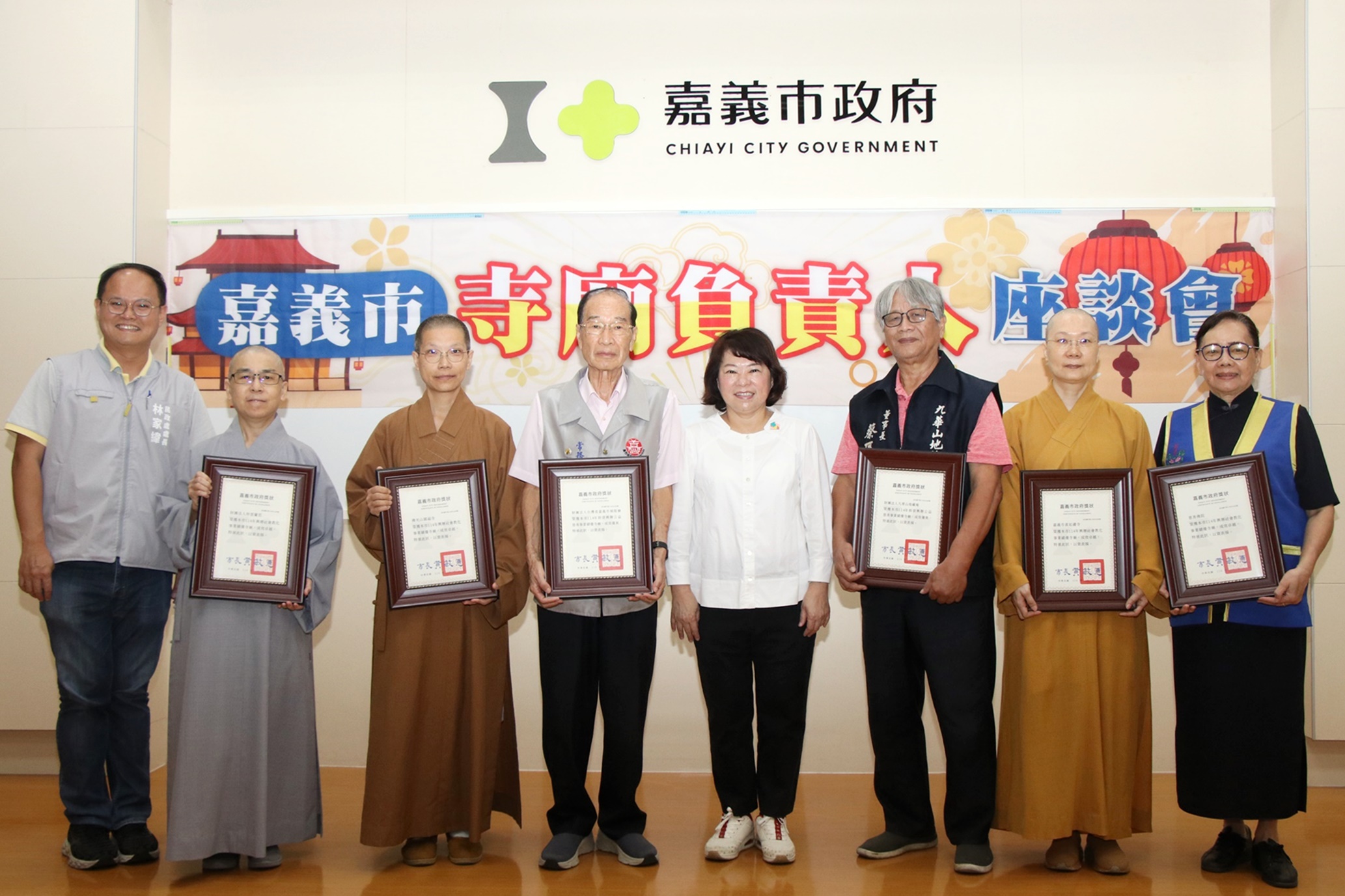 嘉義市許多廟宇長期熱心公益慈善,市府今(1)日上午於市府8樓,辦理寺廟負責人座談會,交流意見。黃敏惠市長也親自頒發114年辦理公益慈善、社會教化事業績優寺廟獎狀、贊助寺廟負責人聯誼活動感謝狀,以及114年宗教場所低碳認證等,感謝各寺廟致力社會教化、協助市府照顧弱勢族群、支持市府各項建設。