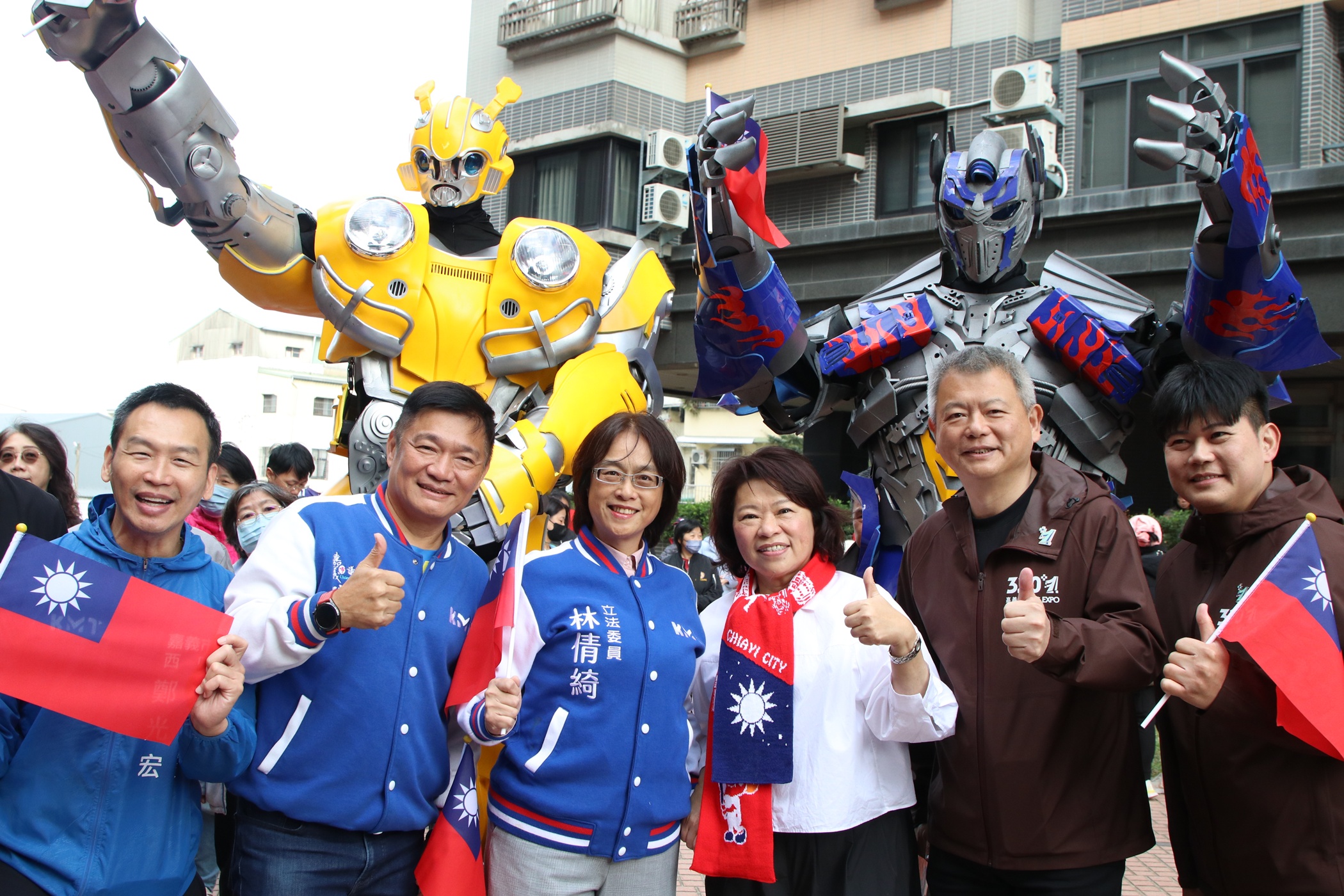 今(115)年精忠新城社區典禮特別融入創意巧思,有象徵守護力量的「變形金剛」與俏皮的「七個小矮人」穿梭人群中,與親子家庭驚喜互動。另外亦結合全民國防教育宣導與在地特色文創市集,讓市民在迎接新年第一天的同時,既能感受到保家衛國的使命感,更能輕鬆品味嘉義的城市魅力。