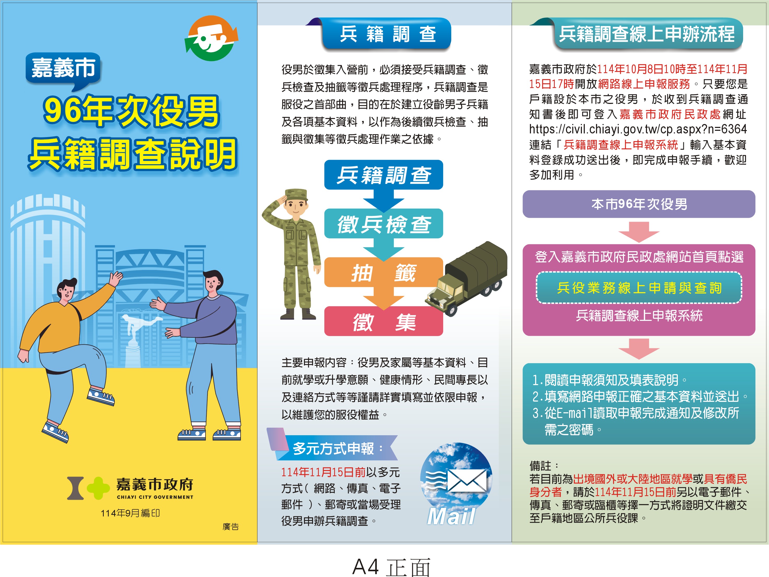 為了讓您免於出門即可完成兵籍調查,本年度(114年)系統開放時間10月8日上午10時至11月15日下午5時止),只要您是戶籍設於本市之役男,經兵籍調查通知後可登入嘉義市政府民政處網站 > 兵役業務線上申請與查詢 > 兵籍調查線上申報系統 網址https:// https://civil.chiayi.gov.tw/cp.aspx?n=6364,役男首次申請時,只需輸入統號、出生日期、戶籍所在地及圖形驗證碼即可開始進行申請,申請成功後系統將透過電子郵件寄發密碼函給役男,役男如需修改先前填報之資料,需輸入密碼方能進入網站,開放期間內不限制修改次數。